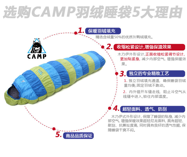 イタリアCampカンプ伸縮性羽毛寝袋屋外超軽量加厚寝袋をダブルミミ型寝袋400 gダウン7℃/2℃に組み付けることができます。