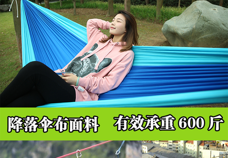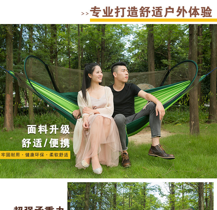 屋外ベッドネットハンモック屋外蚊帳付のシングルペア落下傘布学生野外寮ブランコ登山カジュアル自車旅行自動蚊帳付き-天藍綴ピンク(ペア)