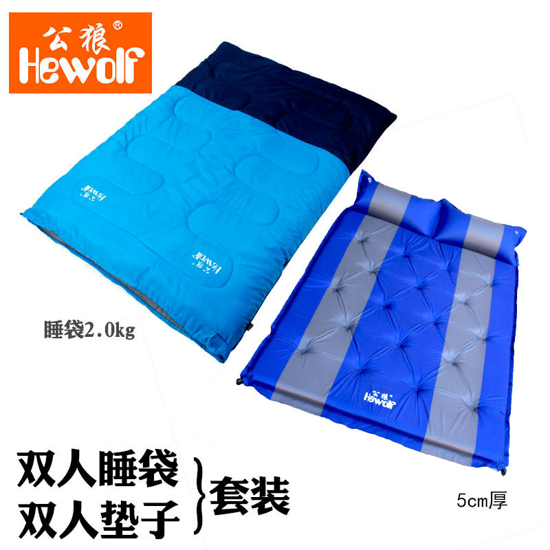 公狼屋外寝袋大人保温冬寝袋大人用屋外春夏秋野キャンプ寝袋と自動空気充填パッドセット防湿パッドダブルコース3.5 cm厚いマットと2.0 kgの寝色